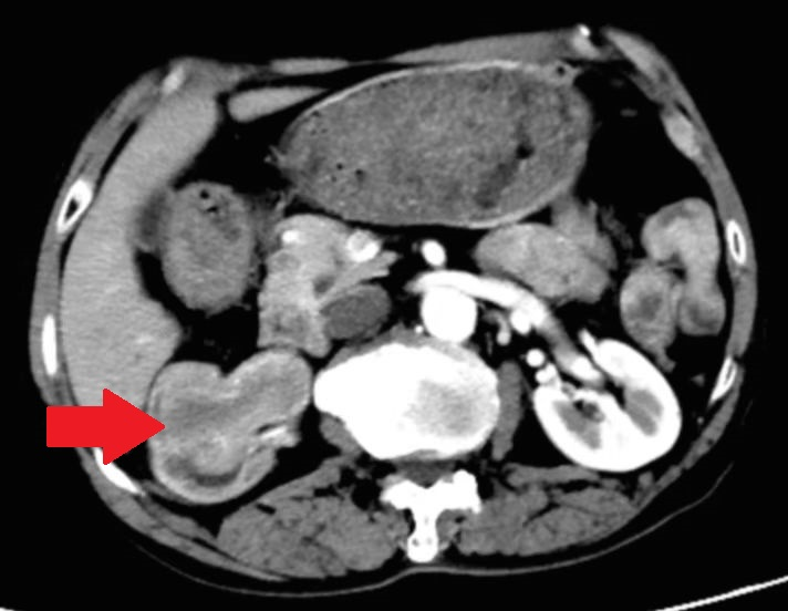 经过详细的增强CT检查,医生发现该患者的右肾下极、肾盂及右输尿管上段出现了占位性病变,初步考虑为恶性肿瘤,肿瘤最大层面达到5公分。这一发现让患者和家属倍感焦虑,但在泌尿外科团队的精心医治下,患者最终得到了有效的治疗。
