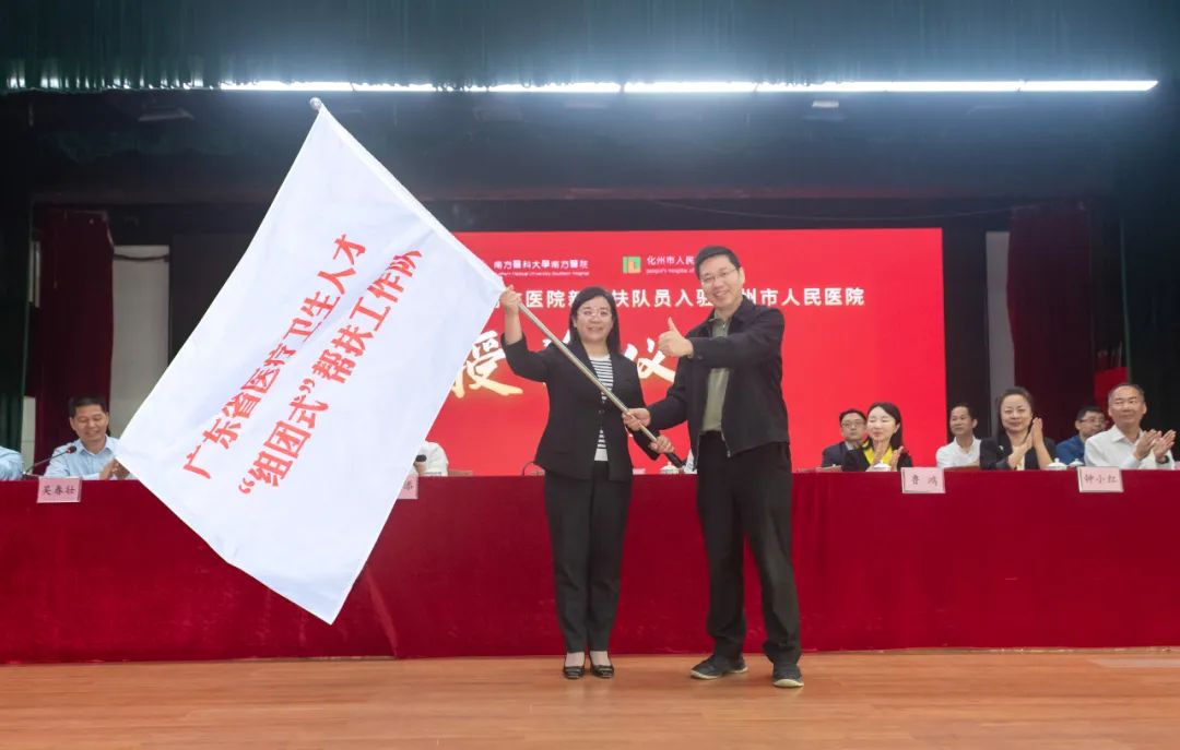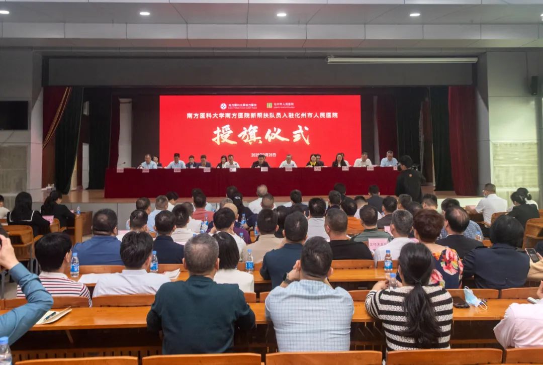 3月26日,南方医科大学南方医院新帮扶队员入驻我院,授旗仪式在二号楼七楼举行。南方医科大学南方医院党委书记蒋鸿、副院长鲁鸿等多位领导及专家队员,以及茂名市卫健局党组书记、局长何泽添,化州市委副书记、市长梁金福等政府及卫健部门领导参加仪式。仪式由化州市副市长吴春壮主持。